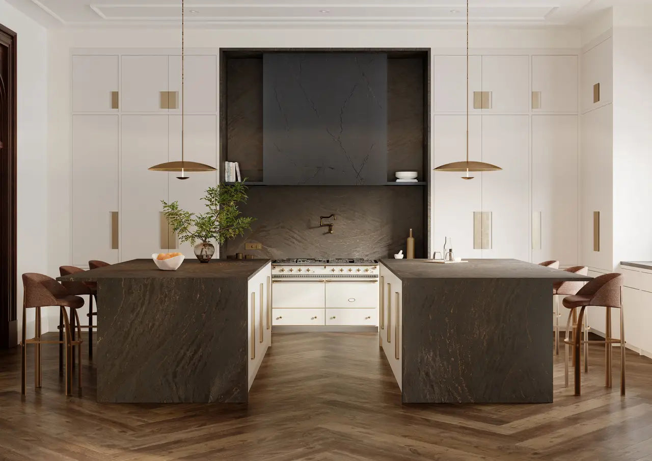 Cambria Remington Brass 132''x 65.5'' 2 cm Satin Quartz Slab.