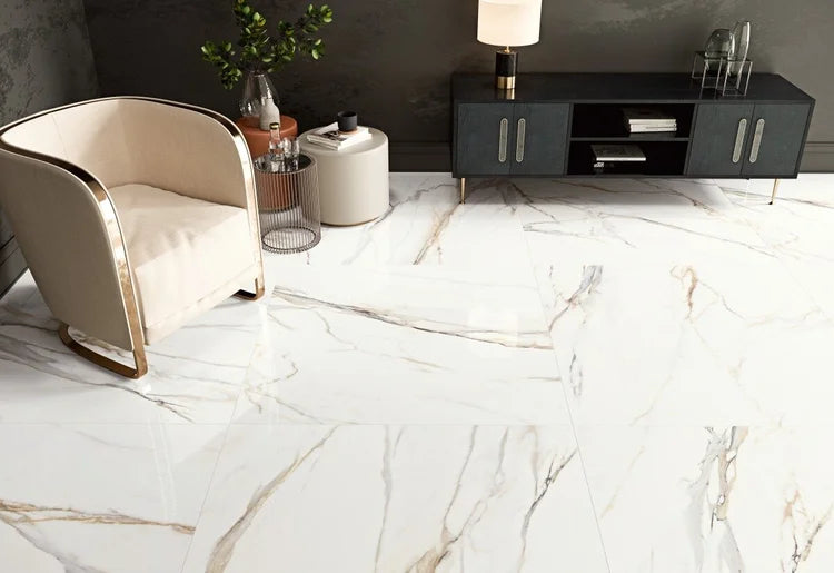 A premium large-format polished tile that captures the luxurious elegance of Calacatta marble. It features a bright white base with delicate grey veining and warm gold highlights.